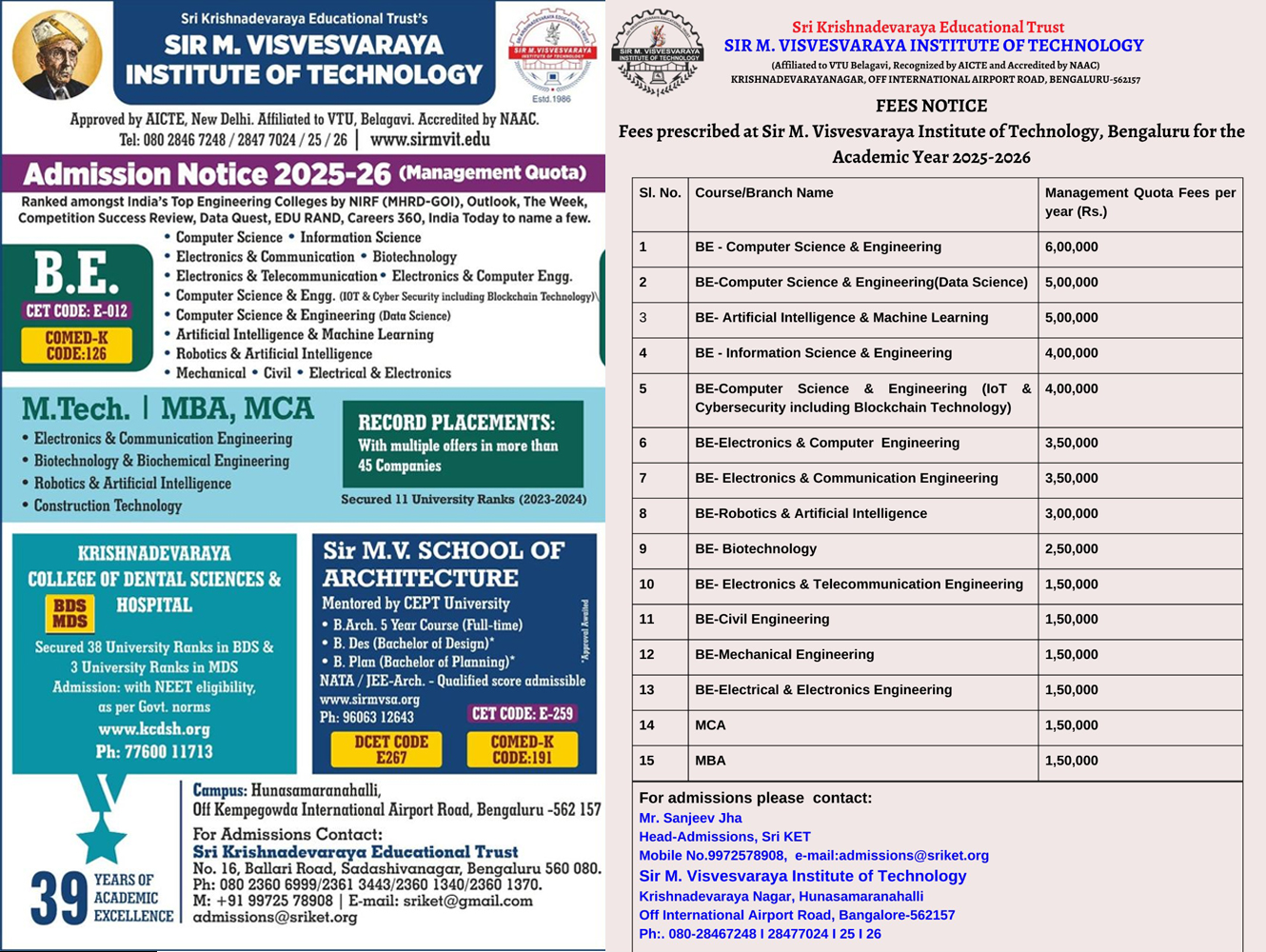 Sir M. Visvesvaraya Institute of Technology (Sir MVIT) is a Higher Education Institution in the state of Karnataka, founded by the Sri Krishnadevaraya Educational Trust in 1986. The Institute offers thirteen B.E. degree programs in Artificial Intelligence & Machine Learning, Biotechnology, Civil Engineering, Computer Science & Engineering, Computer Science & Engineering(Data Science), CSE (IoT & Cybersecurity including Blockchain Technology), Electronics & Communication Engineering, Electronics and Computer Engineering, Electrical & Electronics Engineering, Electronics & Telecommunication Engineering, Information Science & Engineering, Mechanical Engineering, Robotics & Artificial Intelligence.