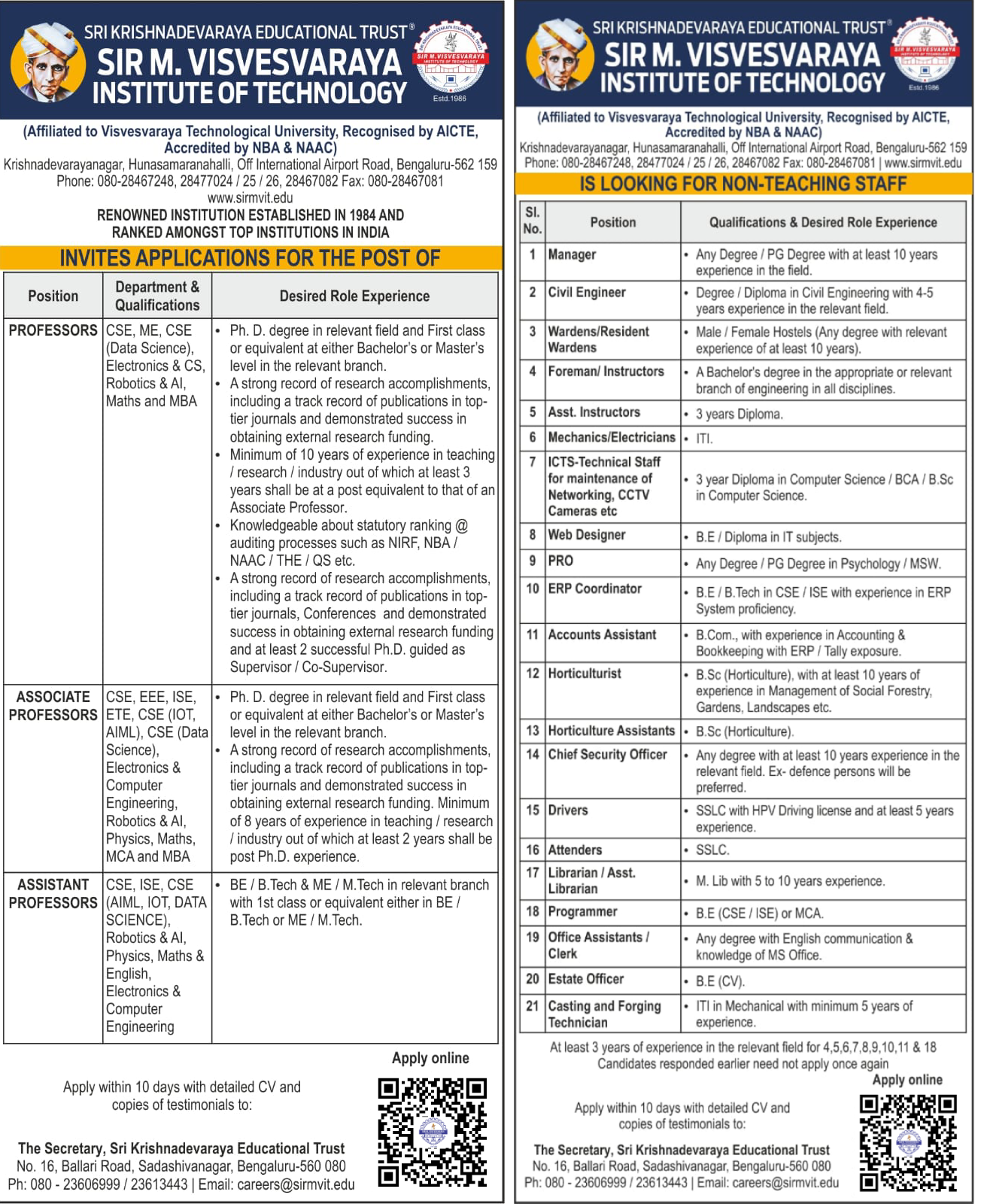 Sir M. Visvesvaraya Institute of Technology (Sir MVIT) is a Higher Education Institution in the state of Karnataka, founded by the Sri Krishnadevaraya Educational Trust in 1986. The Institute offers thirteen B.E. degree programs in Artificial Intelligence & Machine Learning, Biotechnology, Civil Engineering, Computer Science & Engineering, Computer Science & Engineering(Data Science), CSE (IoT & Cybersecurity including Blockchain Technology), Electronics & Communication Engineering, Electronics and Computer Engineering, Electrical & Electronics Engineering, Electronics & Telecommunication Engineering, Information Science & Engineering, Mechanical Engineering, Robotics & Artificial Intelligence.