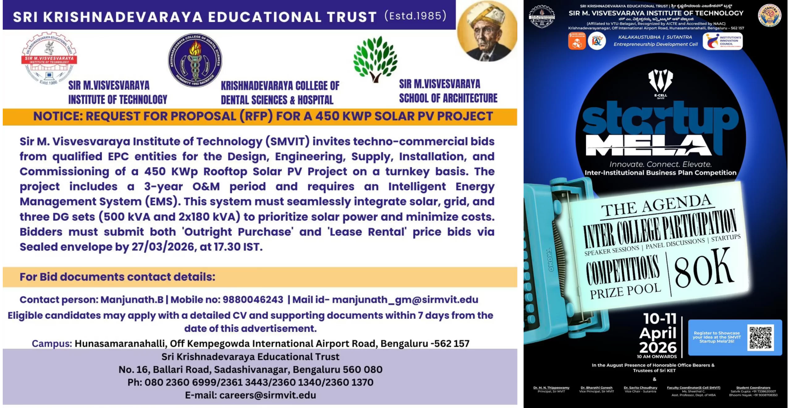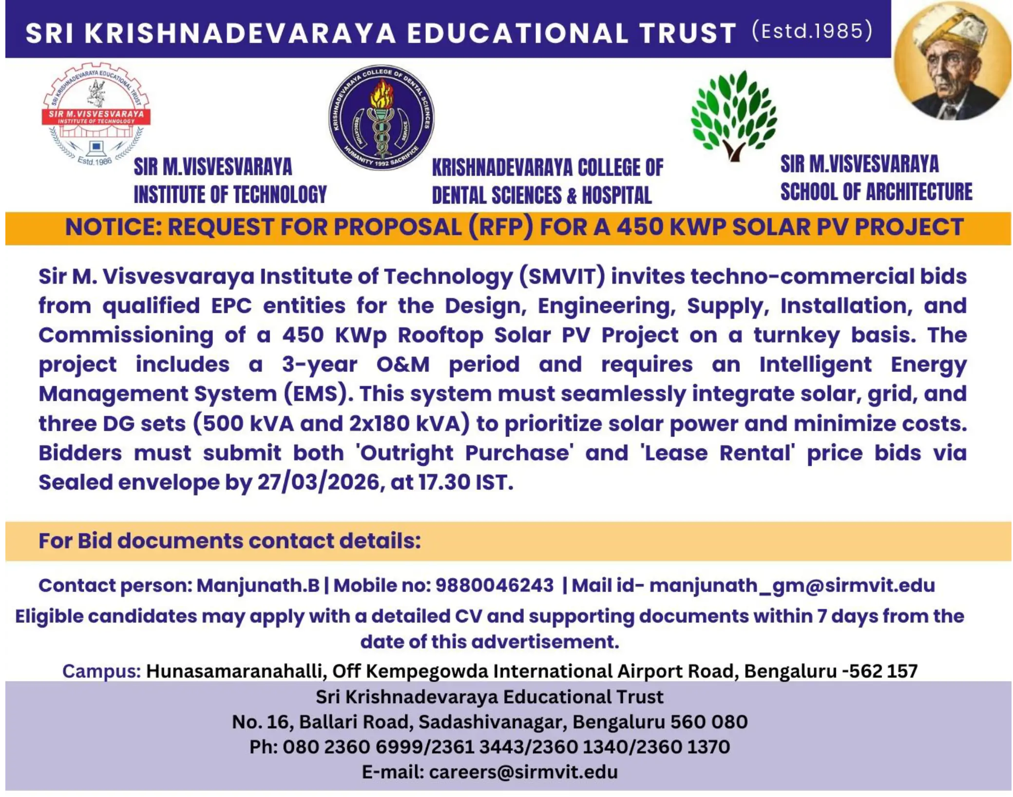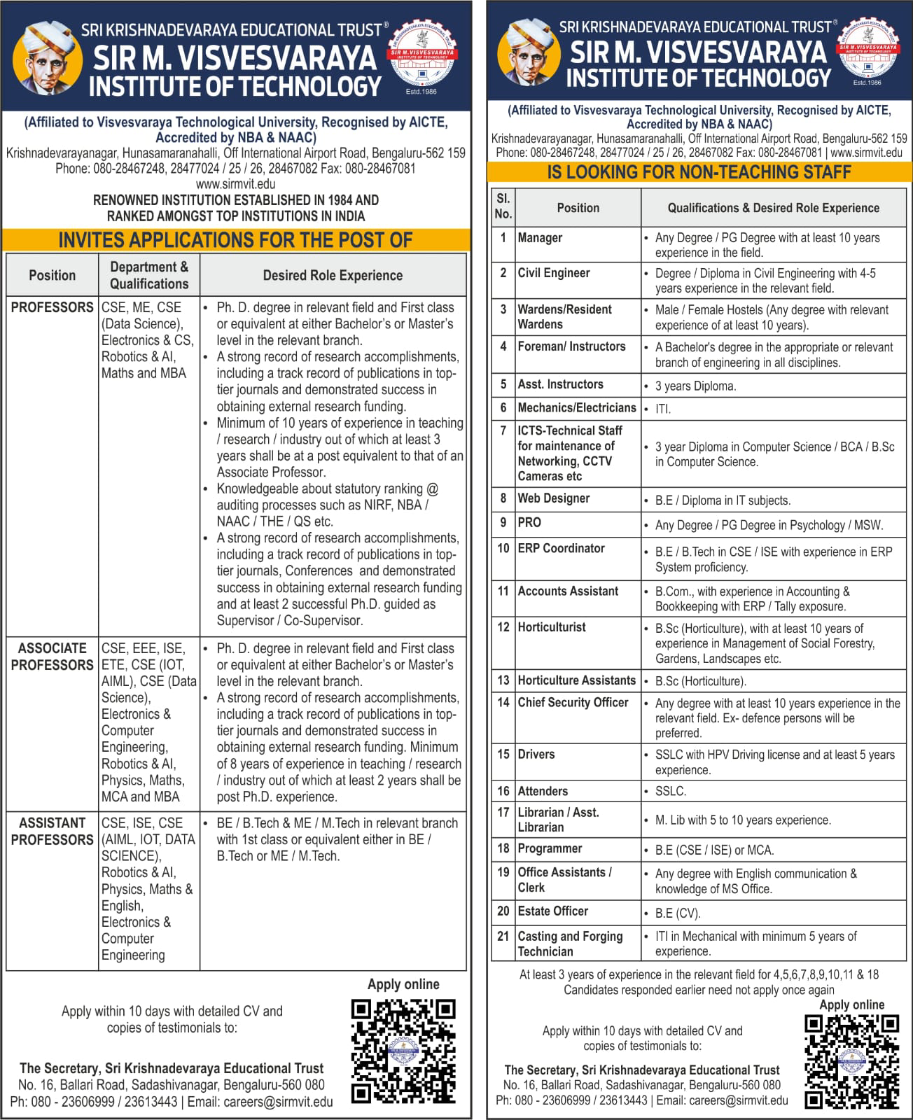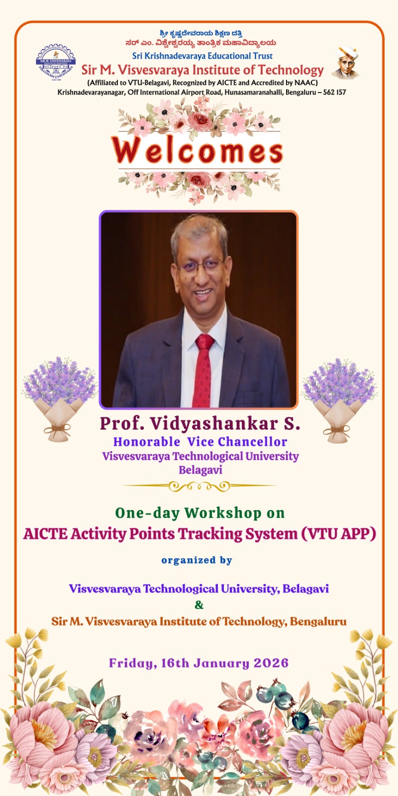 Sir M. Visvesvaraya Institute of Technology (Sir MVIT) is a Higher Education Institution in the state of Karnataka, founded by the Sri Krishnadevaraya Educational Trust in 1986. The Institute offers thirteen B.E. degree programs in Artificial Intelligence & Machine Learning, Biotechnology, Civil Engineering, Computer Science & Engineering, Computer Science & Engineering(Data Science), CSE (IoT & Cybersecurity including Blockchain Technology), Electronics & Communication Engineering, Electronics and Computer Engineering, Electrical & Electronics Engineering, Electronics & Telecommunication Engineering, Information Science & Engineering, Mechanical Engineering, Robotics & Artificial Intelligence.