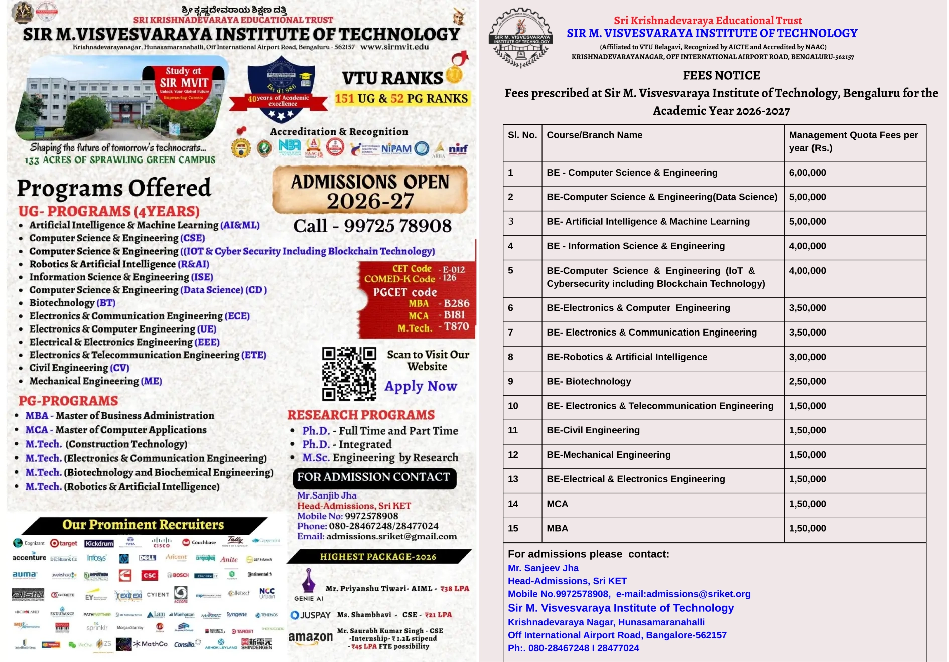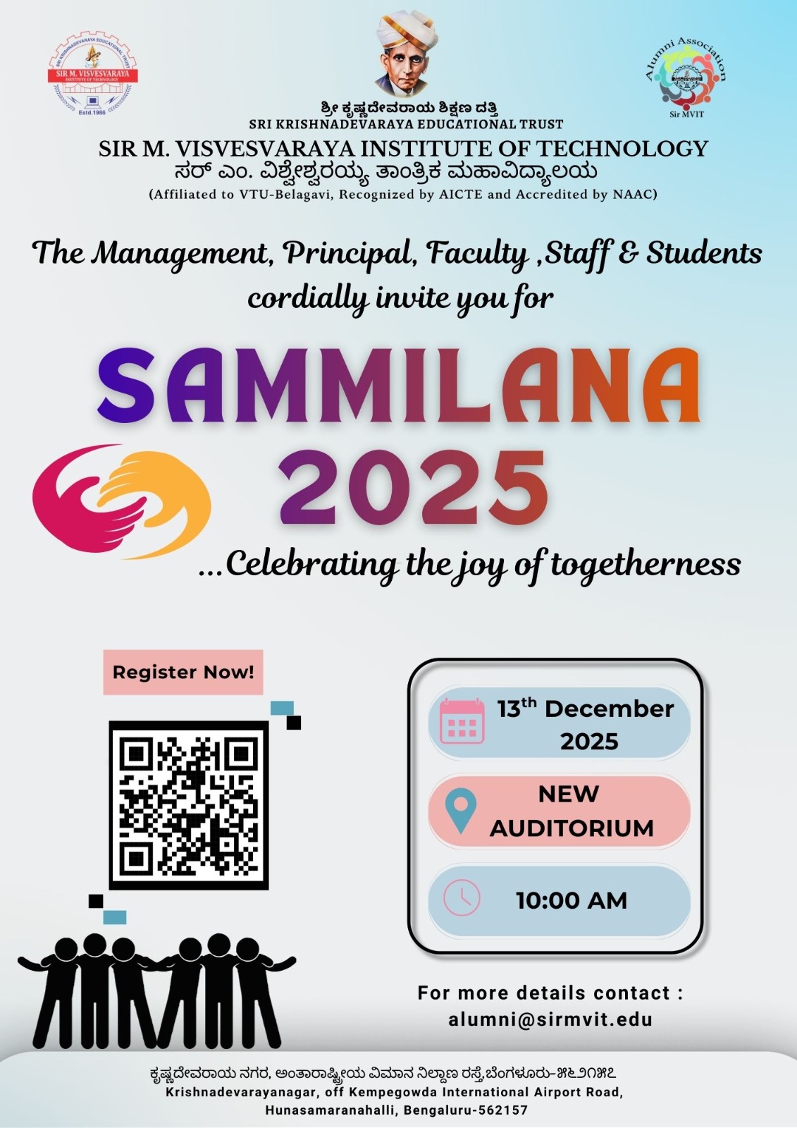 The Institute is affiliated to Visvesvaraya Technological University and approved by All India Council for Technical Education, New Delhi and six of the programs are accredited by National Board of Accreditation, New Delhi. Sir MVIT is also accredited by National Assessment Accreditation Council with ‘A’ grade. All the departments at the Institute have been recognized as R&D centers by the affiliating university.