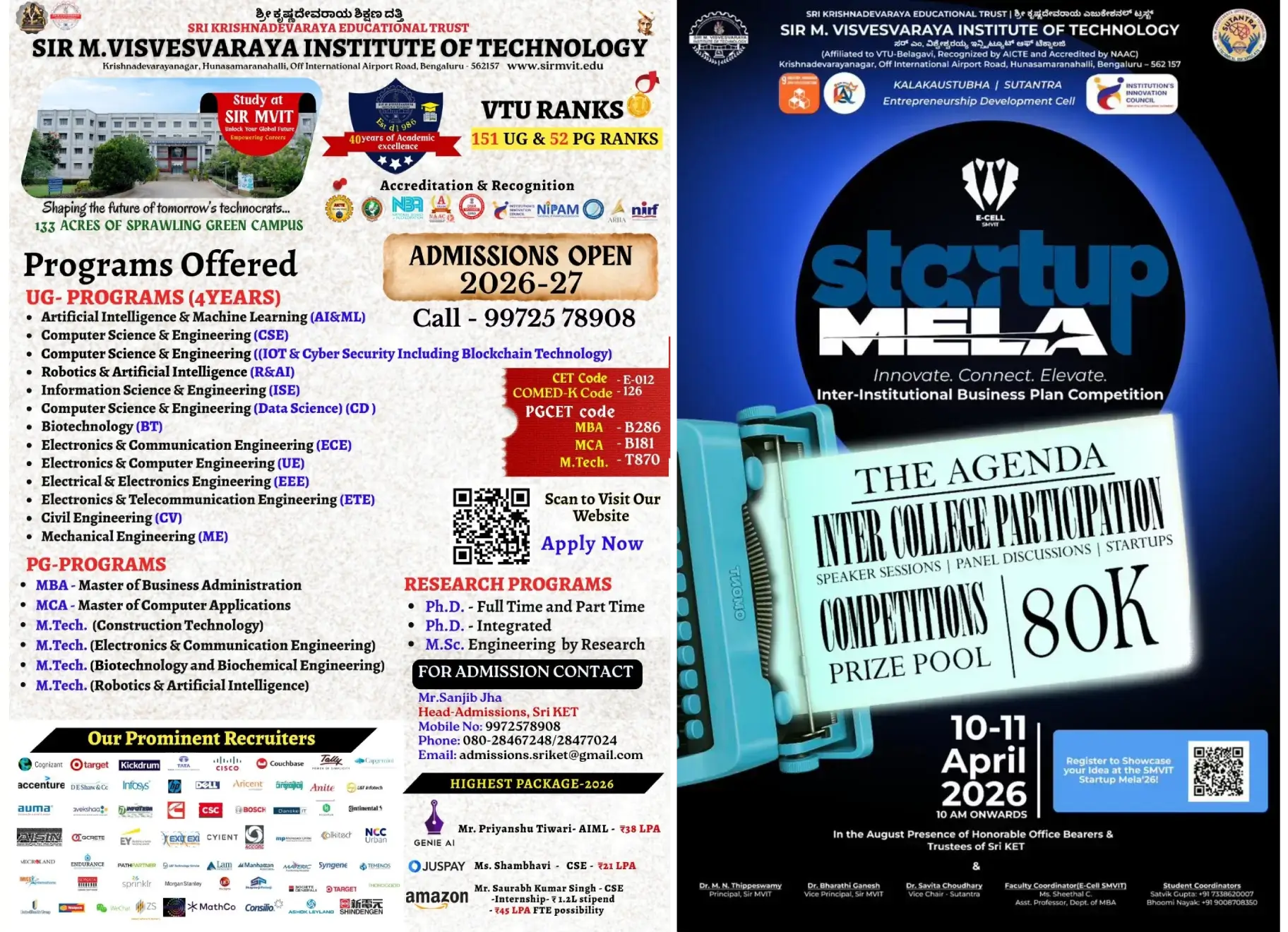 - Statutory Recognitions: Accredited and recognized by AICTE, VTU, NAAC, NBA, and SIRO.