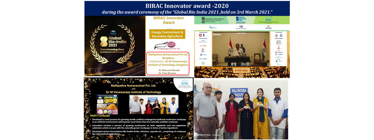 "Dr.Priya Narayan, Associate professor, Dept. of BT, Sir MVIT and Dr. Mousami Mondal and Team from Mallipathra Nutraceutical Private Limited, Incubatee @ Sir MVIT won the BIRAC Innovator award -2020 during the award ceremony of the “Global Bio India 2021 held on 3rd March 2021 by the Board of Biotechnology Industry Research Council (BIRAC), Department of Biotechnology, Government of India.