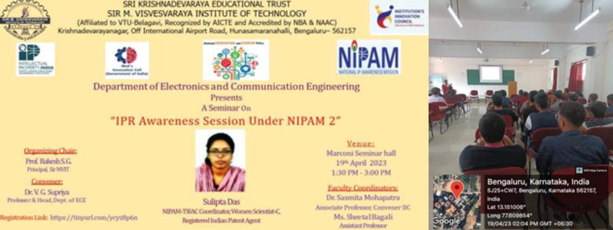 A Seminar on "IPR Awareness Session Under NIPAM 2" in collaboration with NIPAM for S6 and S8 students was organized on 19-04-2023. The resource person was Sulipta Das NIPAM-TIFAC Coordinator, Women Scientist-C, Registered Indian Patent Agent, Bangalore. 60 students participated in the seminar. Dr. Sasmita Mohapatra and Ms. Sheetal Bagali co-ordinated this event.