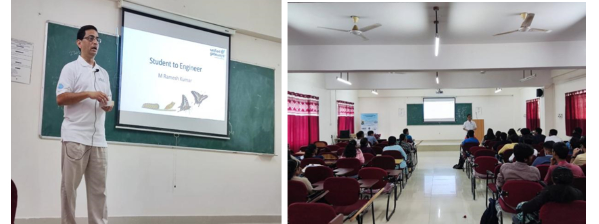 Manoj S Kulkarni, Rajeev P, Chetan Vinayaka, Mithil Dhondi (3 semester Student Coordinators) conducted alunini talk on "The Journey: Student to Engineer" for 3S students on 27-12-2022. 72 students attended the talk. Resource Person: Mr. Ramesh Madakasira, Founder/CEO, Unified Gateways