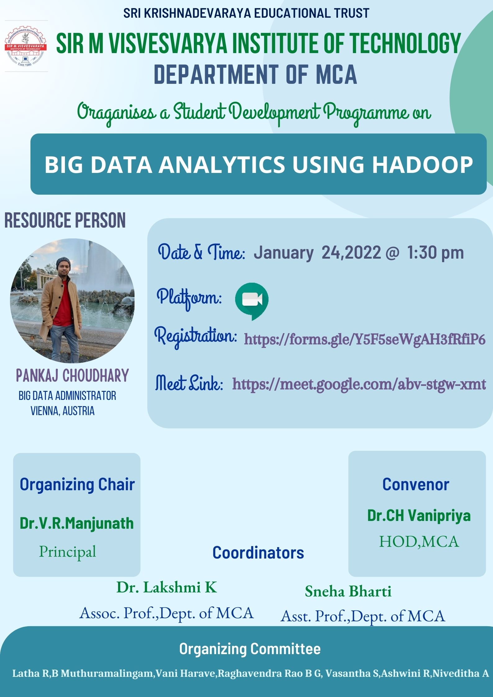 Department of MCA is organizing a student development programme, “Big Data Analytics using Hadoop” on January 24, 2022.